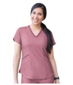 Escote en V con ribete, costuras princesa en el frente y la espalda, y dobladillo estilo camisa para mayor cobertura y estilo.